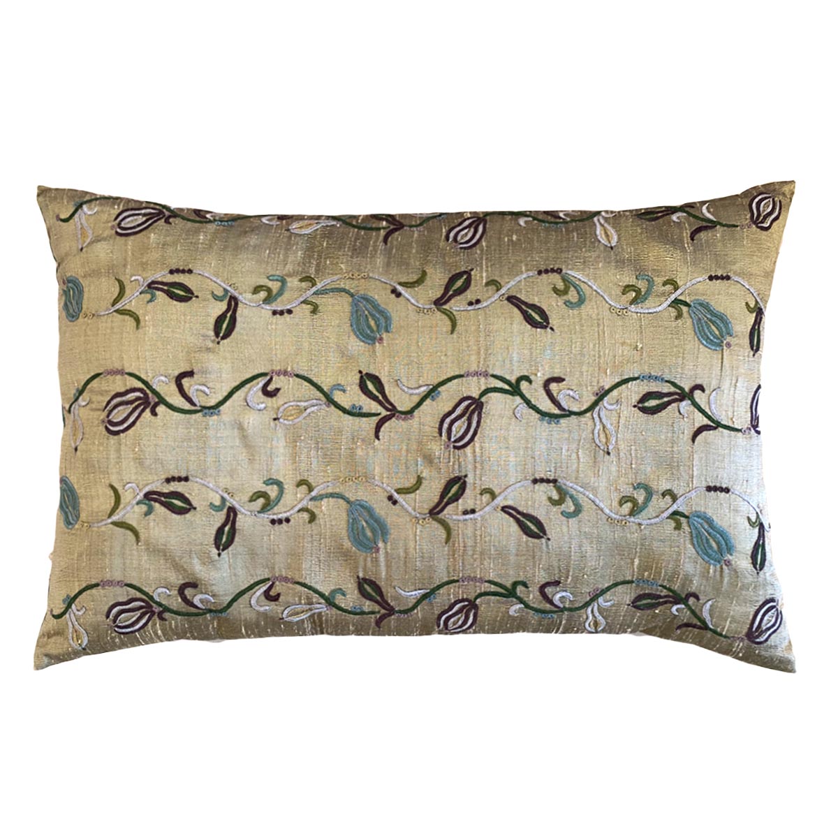 This cushion cover is golden Dupion silk on the front, which has a matte finish. It is hand block printed, and the Trellis motif is then enhanced with Pakko hand embroidery.